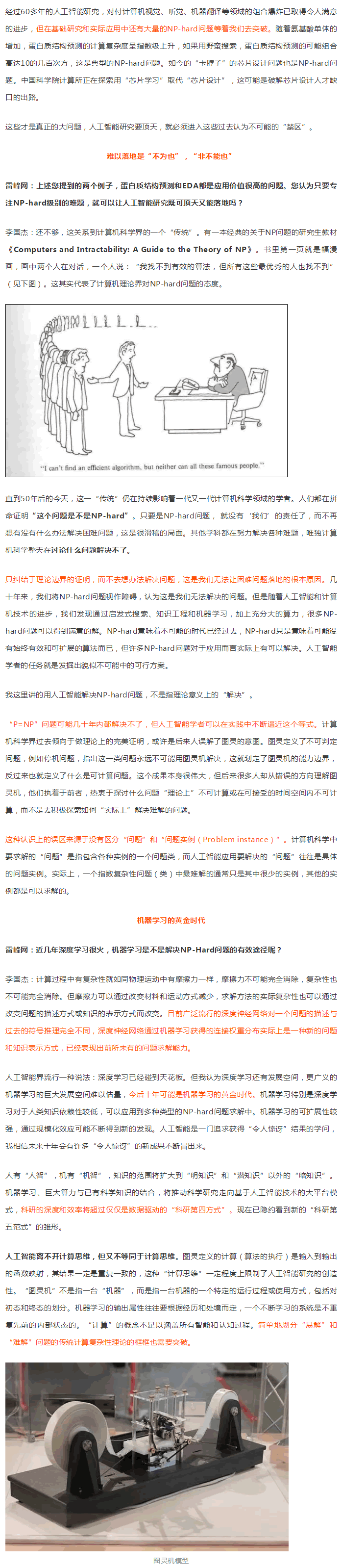 “像人”的人工智能是一個已經被大家很重視的方向,但我認為人工智能的另一個發力點是「解決大問題」。尤其是用機器學習的方法解決意義重大的科學難題,即在多項式時間內“有效解決”指數復雜性問題。