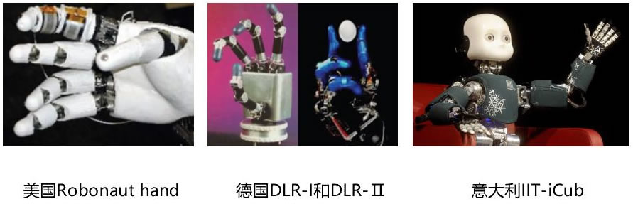 2) 德國宇航中心先后研制成功了 DLR-Ⅰ和 DLR-Ⅱ靈巧手,共集成了 25 個傳感器, 包括類似人工皮膚的觸覺傳感器、關節扭矩傳感器、位置傳感器和溫度傳感器 等,靈巧手在靈活性和感知能力方面有顯著提升。